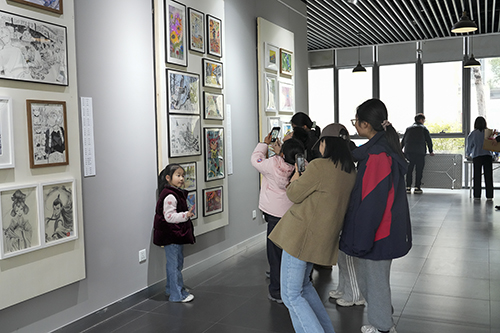 本次展览采用“师生联展”的形式,从“教”与“学”的两个双向主体切入,展出两百余件精选作品,涵盖素描、粉画、油画、水彩、国画、书法、动漫、拼贴、手工创意作品等,充分展示了过去一年的教学与实践成果。开幕活动现场,师生齐聚展厅,一同观展,共同交流作品的创作过程和心得体会,在憧憬中畅想新的一年。