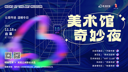 2022年11月18日,由明·美术馆与无忧公关联名策划的“美术馆奇妙夜”主题市集活动正式与大家见面。以“将爱传递,温暖冬日”为创意起点,在明·美术馆一二层展厅及场馆周边,奇妙夜活动策划了美术展览、文创市集、舞台演艺、艺术体验、美食餐饮和休闲娱乐六个板块的精彩内容。