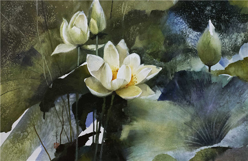 谈及此次展览的主题"流·止",喻春泉表示"流"和"止"是两个动态的词,这是他作画过程中特别在意的。水彩画就是要发挥水和彩的流动性,强调"流",而又不可无限制地任其"流",因此"止"也很重要。水中颜色的多和少便是流动性的变数。这里的难度就在于控制,控制水和色的关系,把握水和纸的关系。水彩画创作离不开水,"流"和"止"贯穿整个水彩画创作的过程,领悟好"流和止",画起来也就得心应手了。这是一个不断画画者的心得。