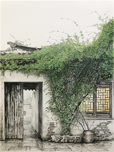 他总能找到独特的角度。在他的取景框里所有的裁切似乎都恰到好处,时光在他的画里像静止了,静悄悄的、美好的。你凝神去看,像驻足在这个建筑面前那样,会有一种惊奇的发现。画里没有人声鼎沸,而似乎反倒是那些本不能言语的老房子,在透过那斑驳的粉墙黛瓦、那绿意盎然的树影婆娑,发出历史的低语。