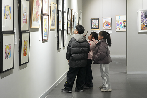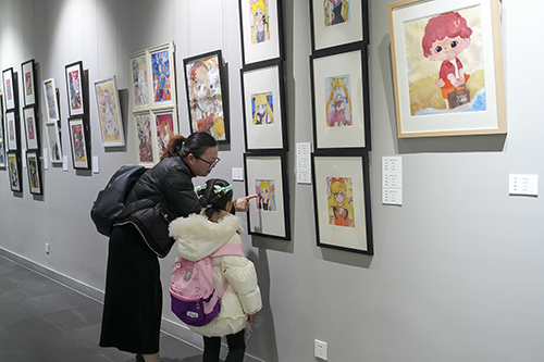 本次展览采用“师生联展”的形式,从“教”与“学”的两个双向主体切入,展出两百余件精选作品,涵盖素描、粉画、油画、水彩、国画、书法、动漫、拼贴、手工创意作品等,充分展示了过去一年的教学与实践成果。开幕活动现场,师生齐聚展厅,一同观展,共同交流作品的创作过程和心得体会,在憧憬中畅想新的一年。